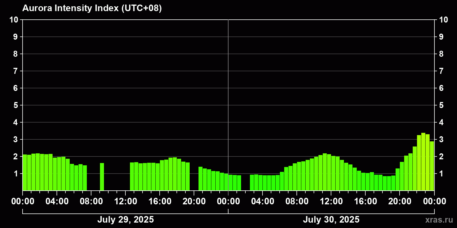Auroral intensity index and the theoretically possible latitude of observations for nighttime in the Estern Hemisphere as of 2025-07-30 23:39 (end of day) local time