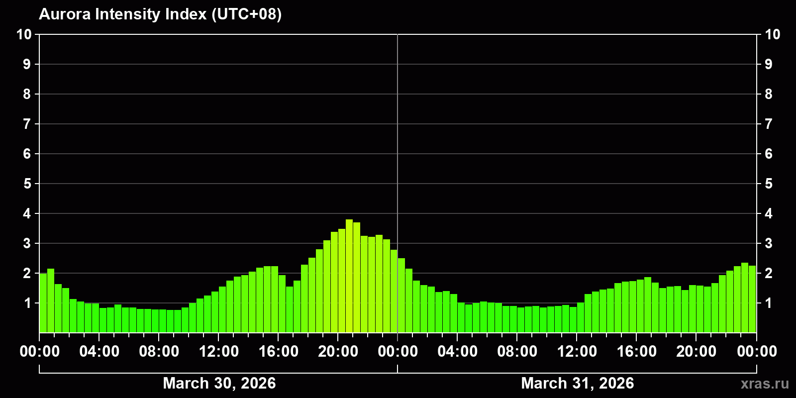 Changes in the auroral intensity index from 2026-03-30 to 2026-03-31 local time