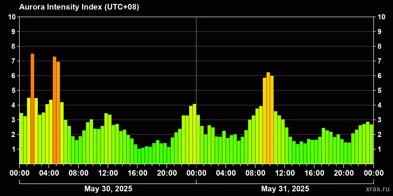 Changes in the auroral intensity index from 2025-05-30 to 2025-05-31 local time