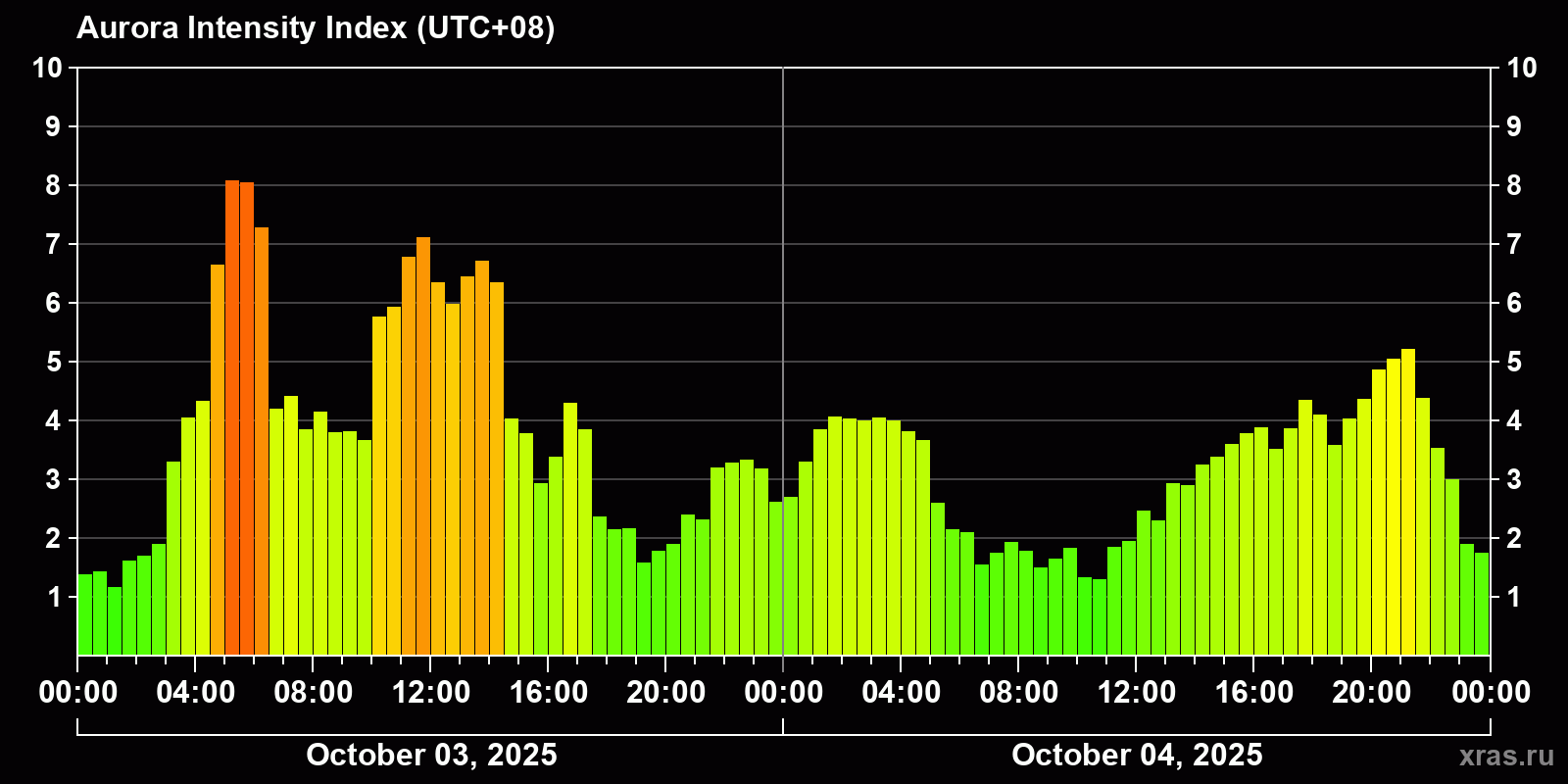 Changes in the auroral intensity index from 2025-10-03 to 2025-10-04 local time