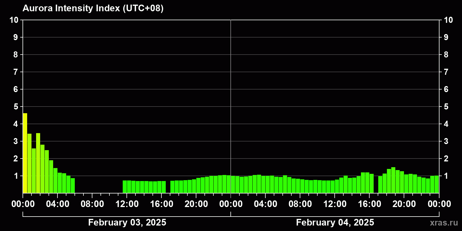 Auroral intensity index and the theoretically possible latitude of observations for nighttime in the Estern Hemisphere as of 2025-02-04 23:48 (end of day) local time