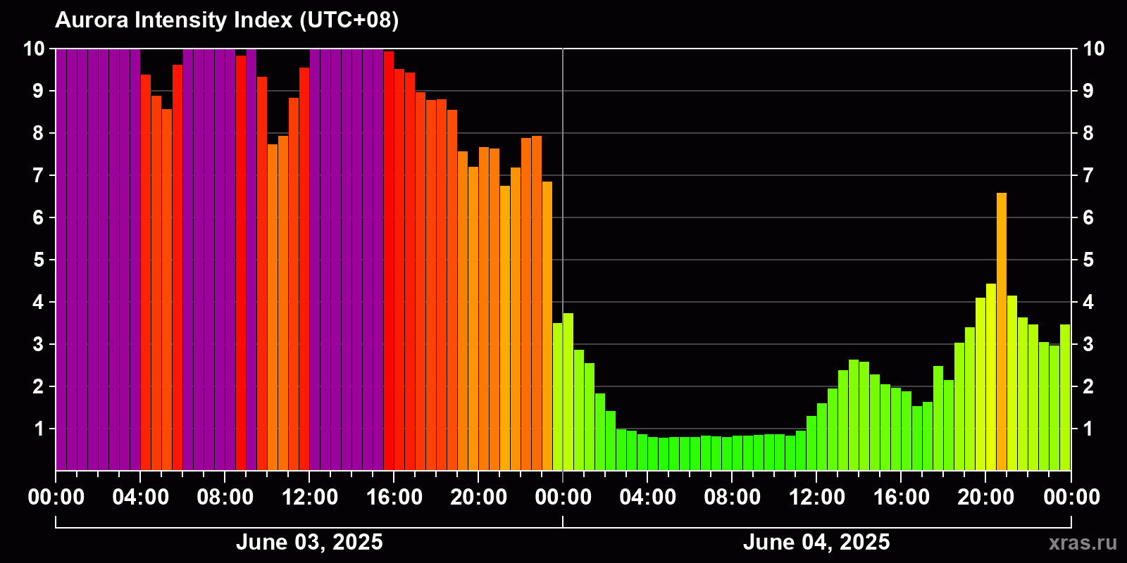 Changes in the auroral intensity index from 2025-06-03 to 2025-06-04 local time