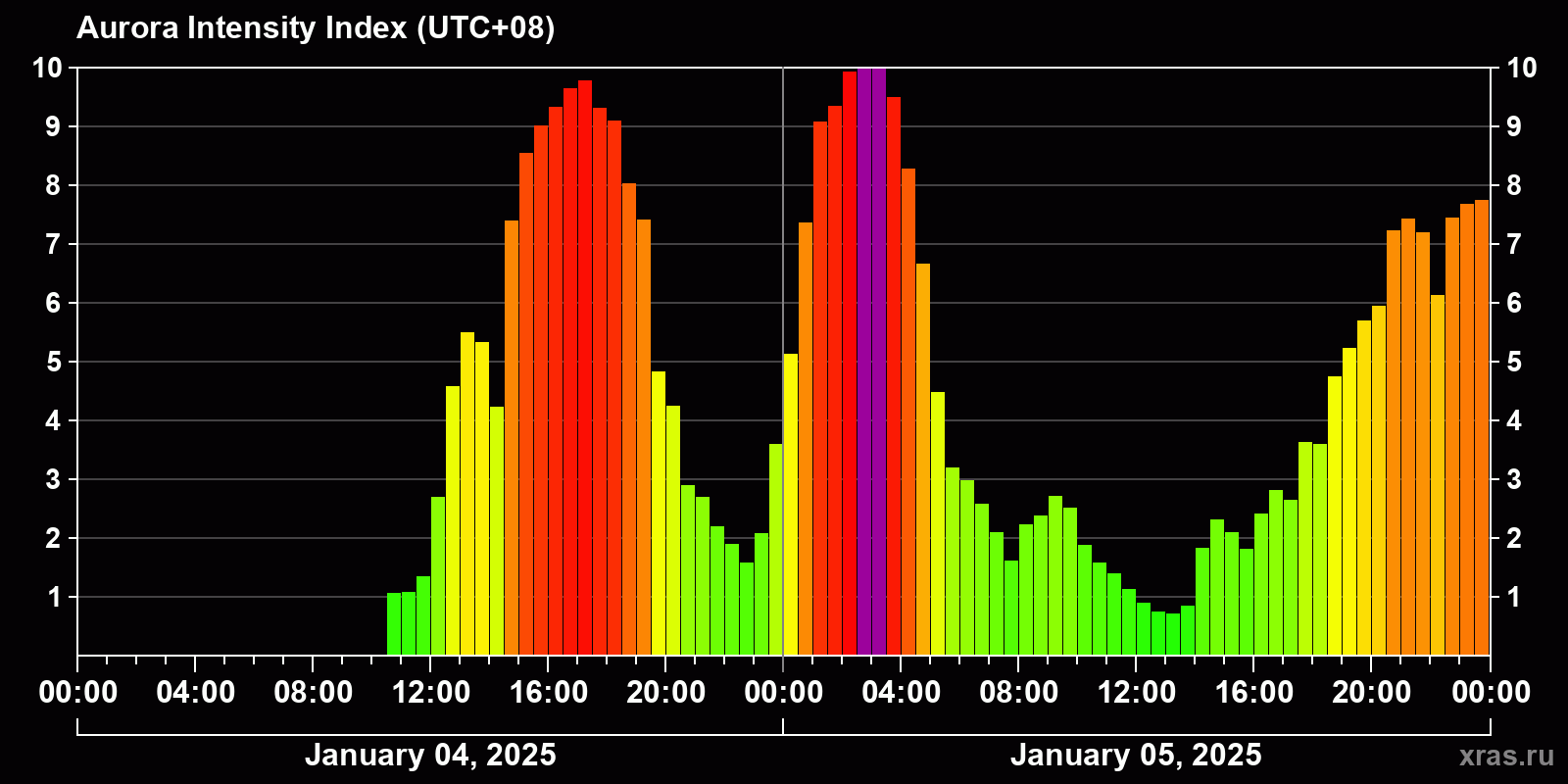 Changes in the auroral intensity index from 2025-01-04 to 2025-01-05 local time