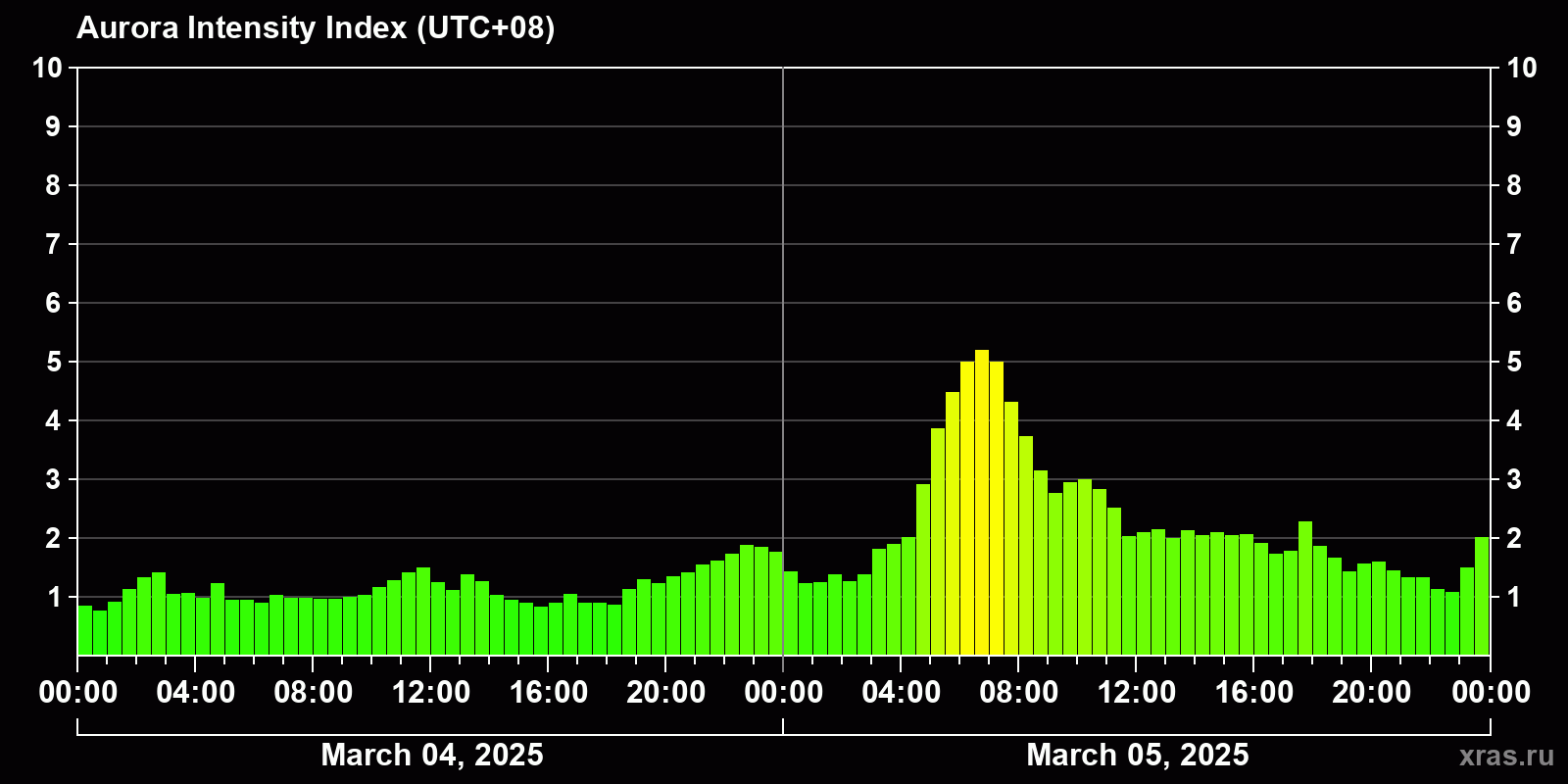 Changes in the auroral intensity index from 2025-03-04 to 2025-03-05 local time