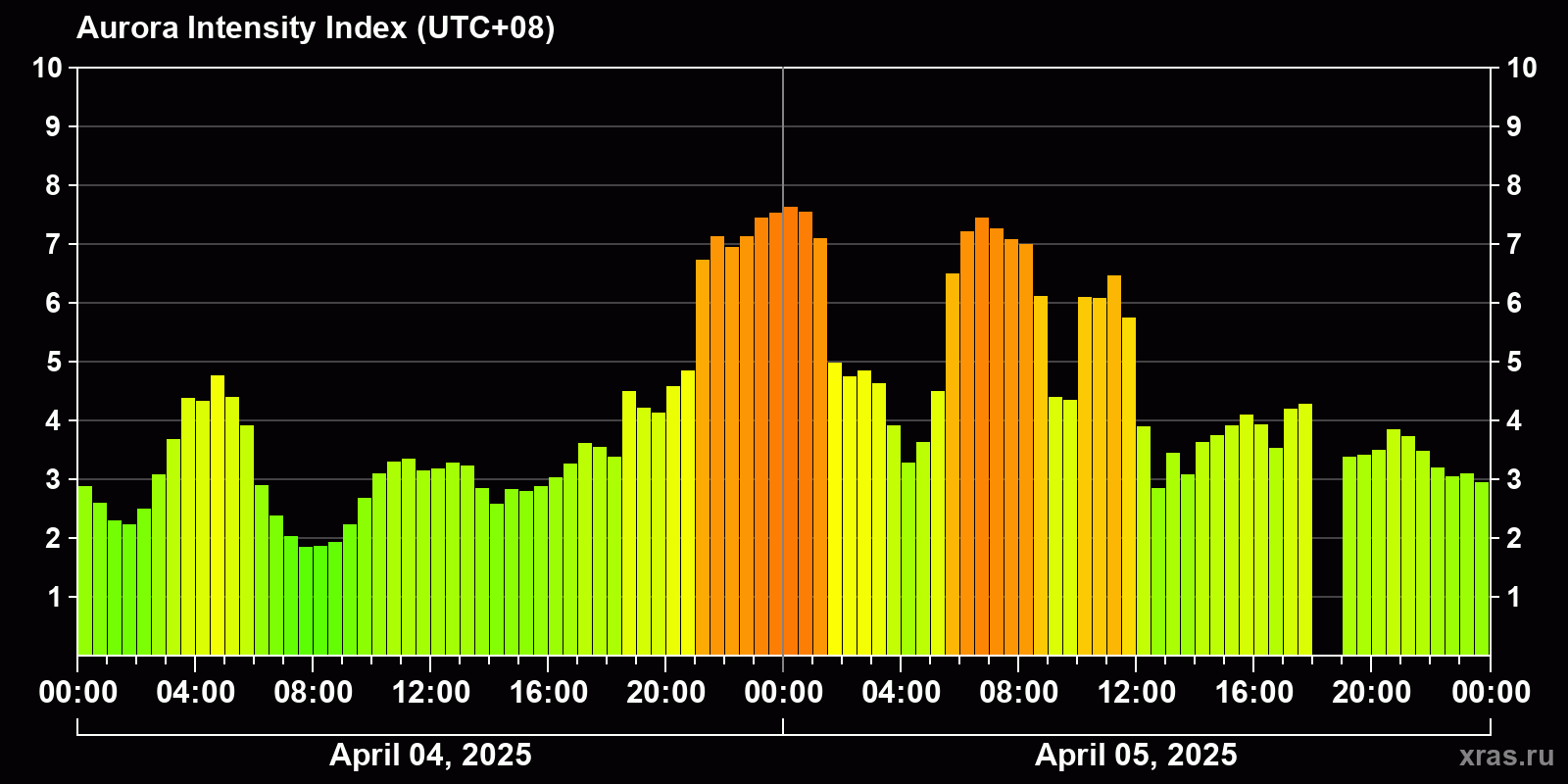Changes in the auroral intensity index from 2025-04-04 to 2025-04-05 local time