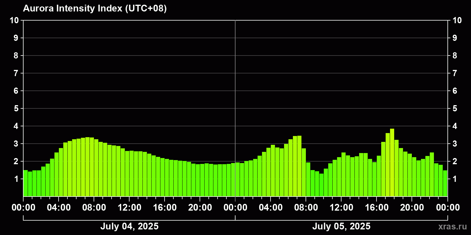 Changes in the auroral intensity index from 2025-07-04 to 2025-07-05 local time