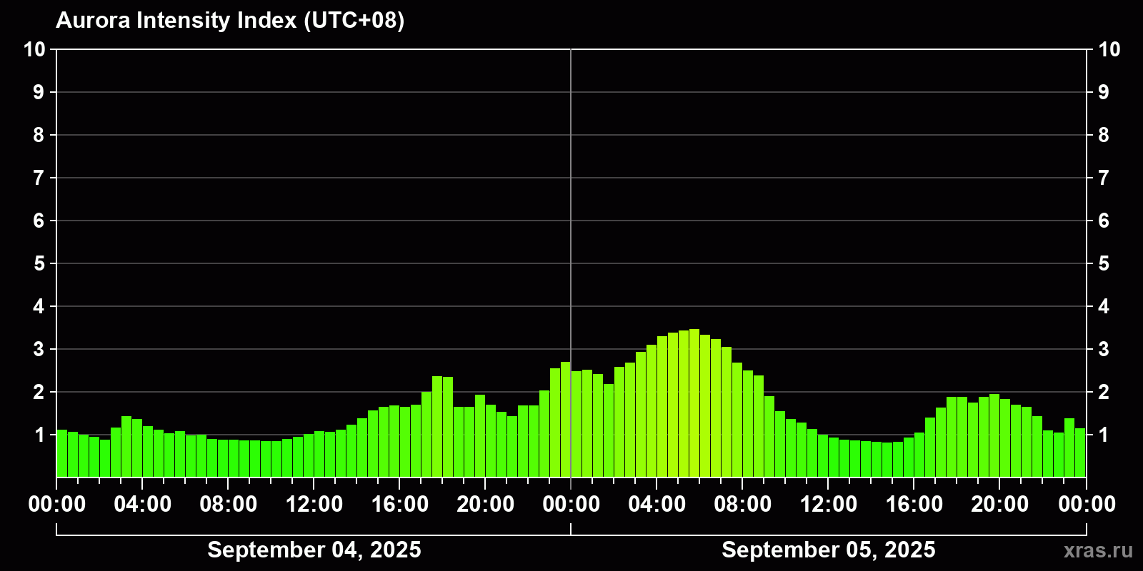 Auroral intensity index and the theoretically possible latitude of observations for nighttime in the Estern Hemisphere as of 2025-09-05 23:52 (end of day) local time