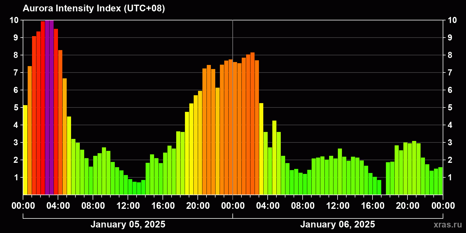 Changes in the auroral intensity index from 2025-01-05 to 2025-01-06 local time