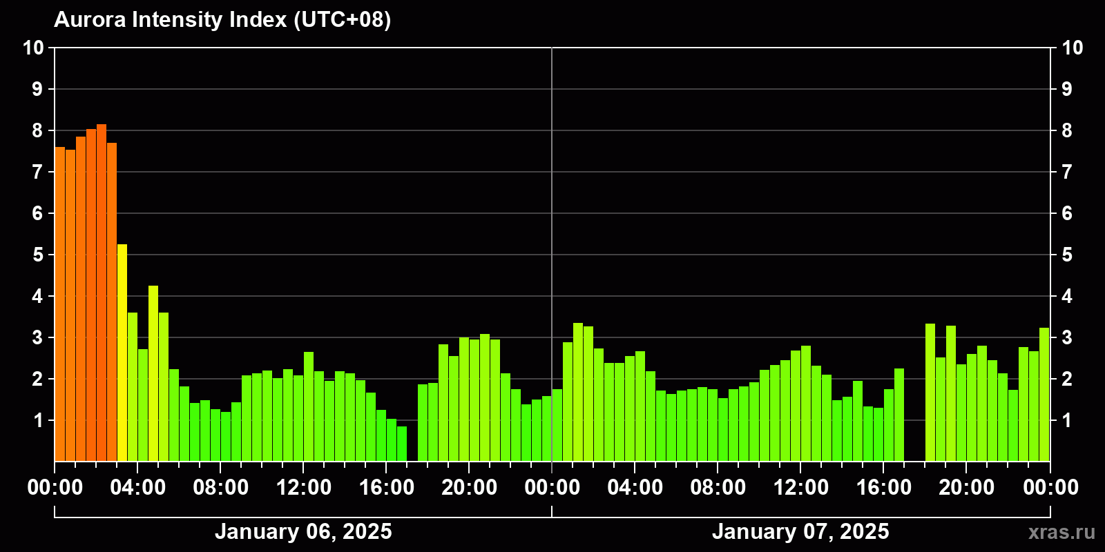 Auroral intensity index and the theoretically possible latitude of observations for nighttime in the Estern Hemisphere as of 2025-01-07 23:48 (end of day) local time