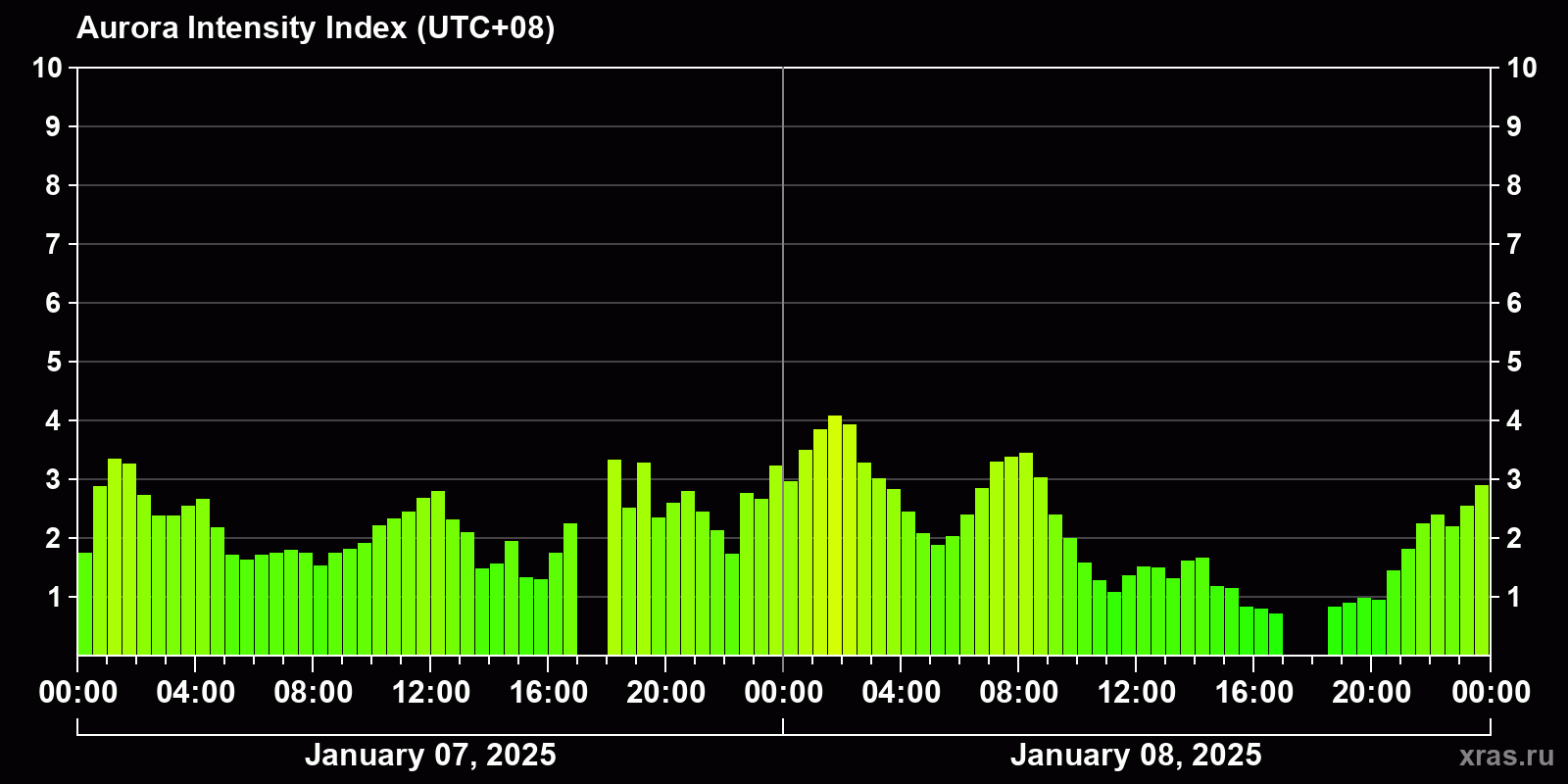 Auroral intensity index and the theoretically possible latitude of observations for nighttime in the Estern Hemisphere as of 2025-01-08 23:55 (end of day) local time