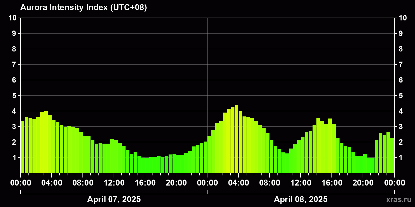 Auroral intensity index and the theoretically possible latitude of observations for nighttime in the Estern Hemisphere as of 2025-04-08 23:53 (end of day) local time