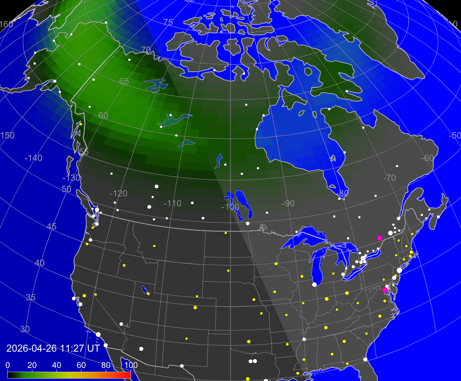 Auroral intensity index and theoretically possible latitude of observations for nighttime in the Western Hemisphere