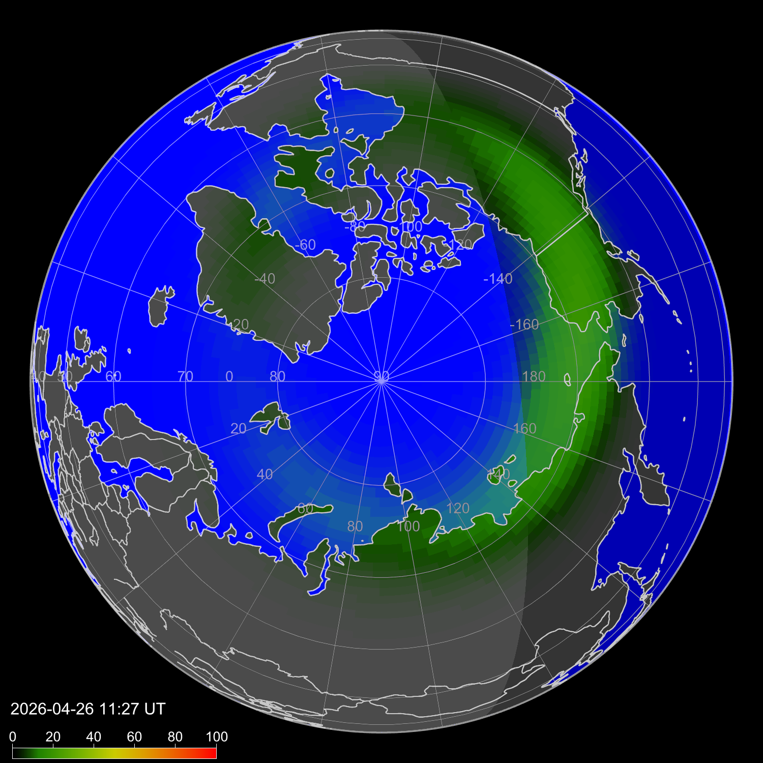 Changes and hourly forecast of the auroral intensity index from 2026-04-25 to 2026-04-26