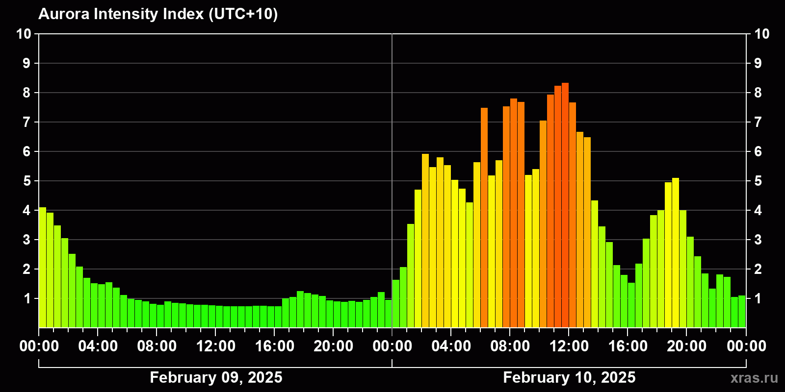 Changes in the auroral intensity index from 2025-02-09 to 2025-02-10 local time