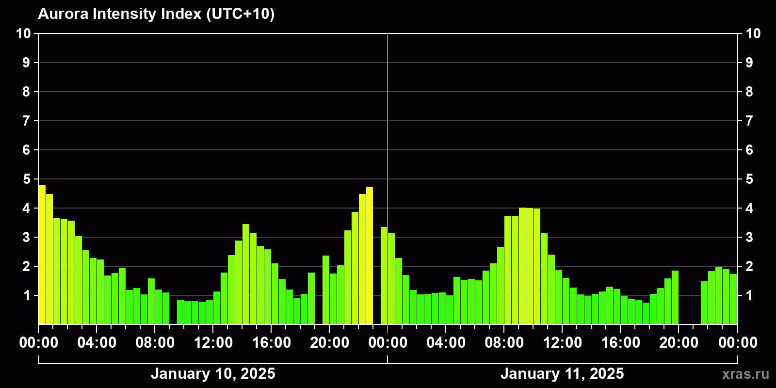 Changes in the auroral intensity index from 2025-01-10 to 2025-01-11 local time