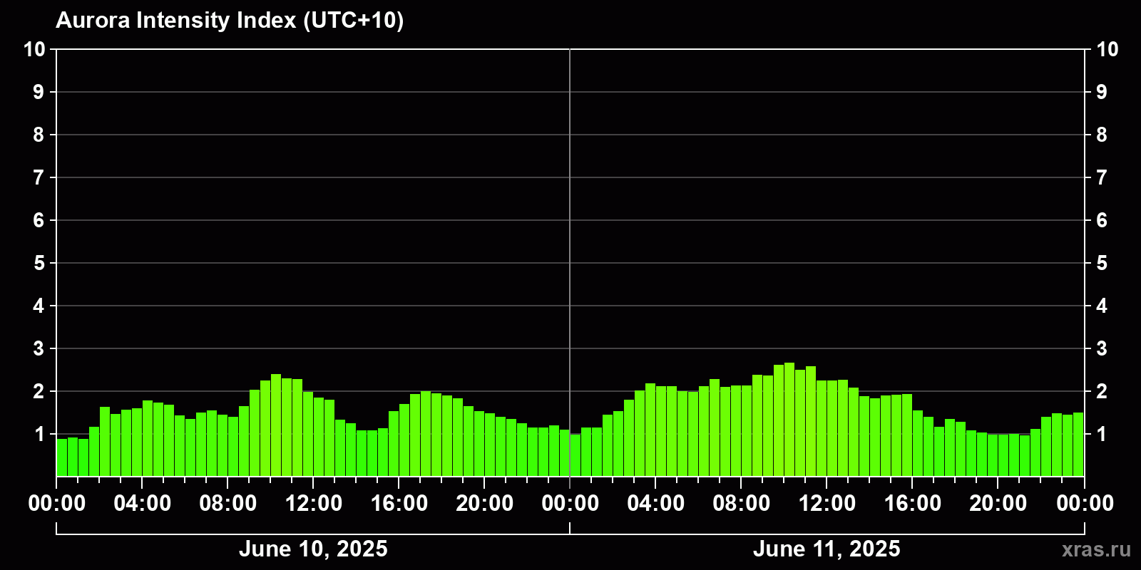 Changes in the auroral intensity index from 2025-06-10 to 2025-06-11 local time