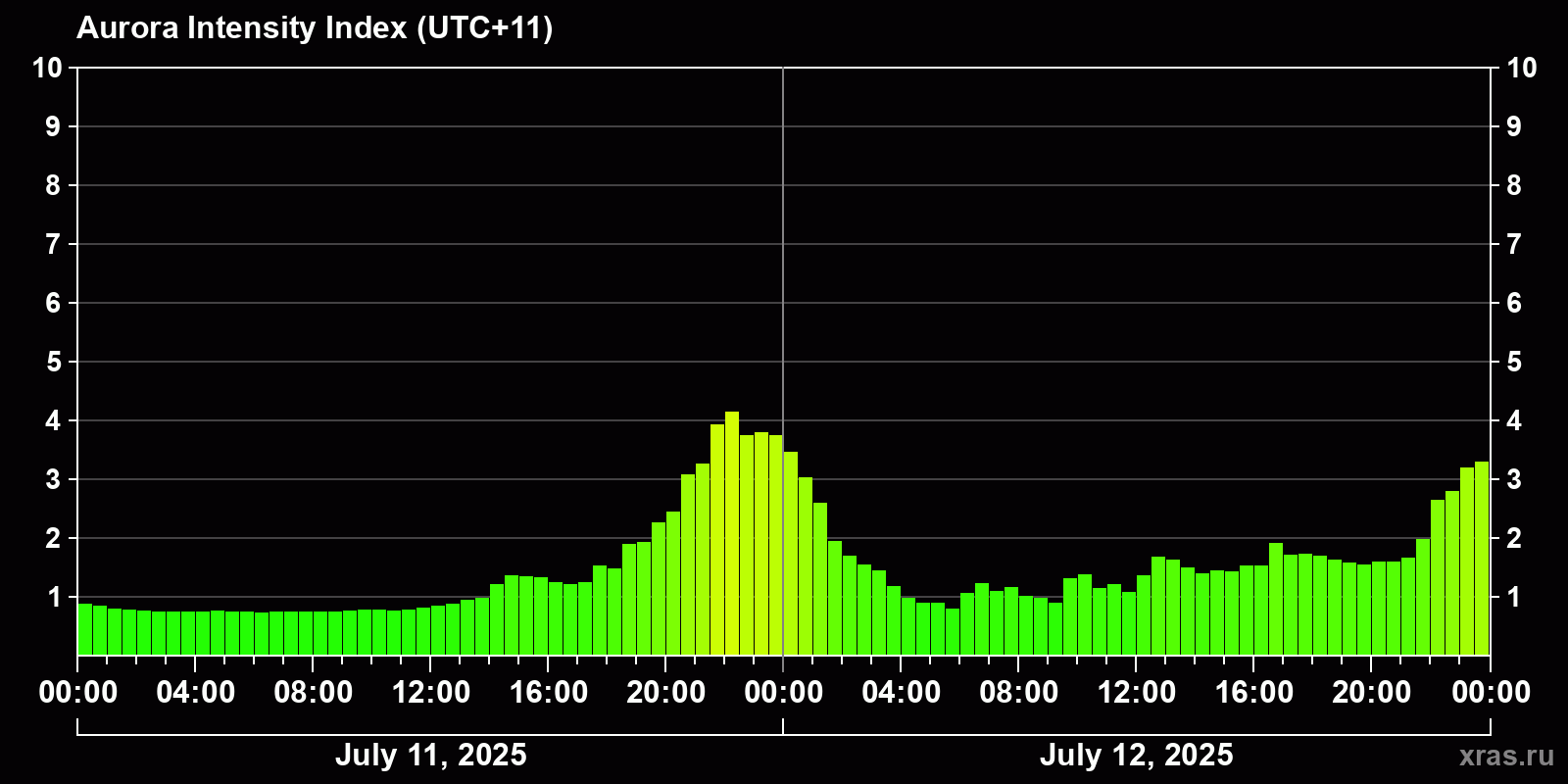 Changes in the auroral intensity index from 2025-07-11 to 2025-07-12 local time