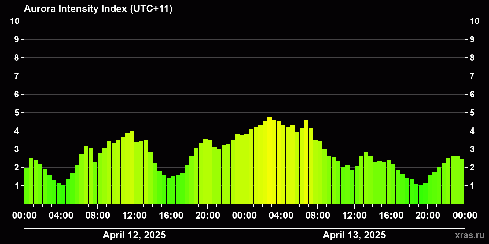 Changes in the auroral intensity index from 2025-04-12 to 2025-04-13 local time