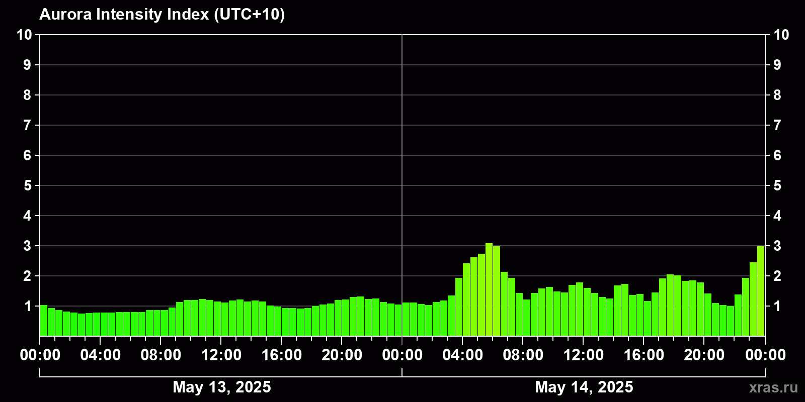 Changes in the auroral intensity index from 2025-05-14 to 2025-05-15 local time