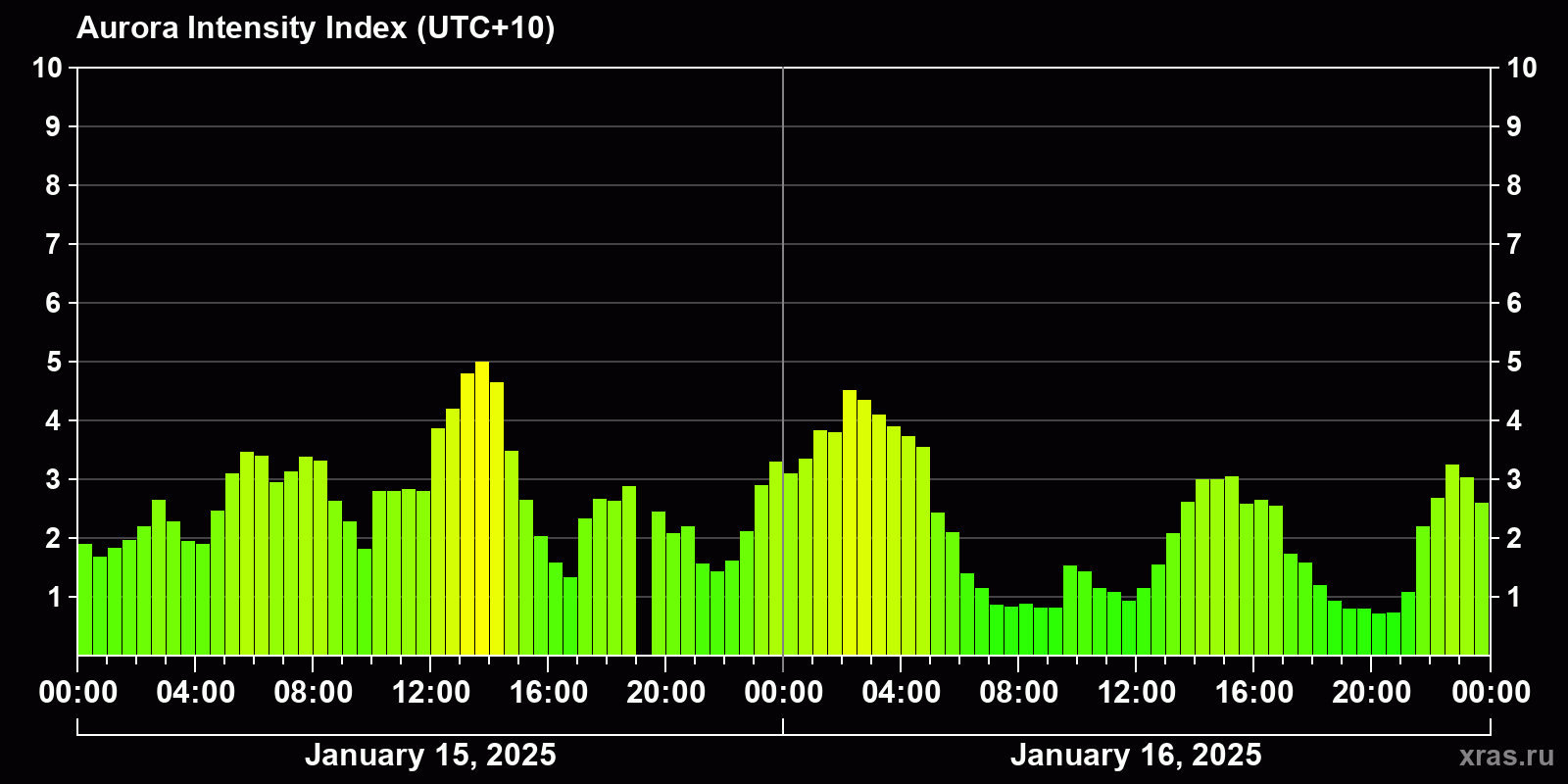 Changes in the auroral intensity index from 2025-01-15 to 2025-01-16 local time