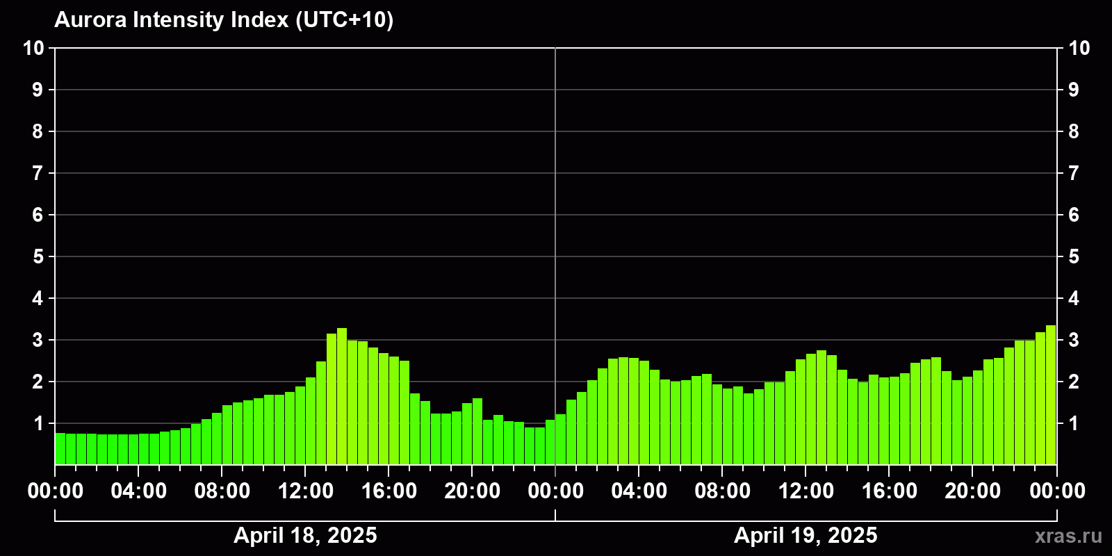 Changes in the auroral intensity index from 2025-04-19 to 2025-04-20 local time