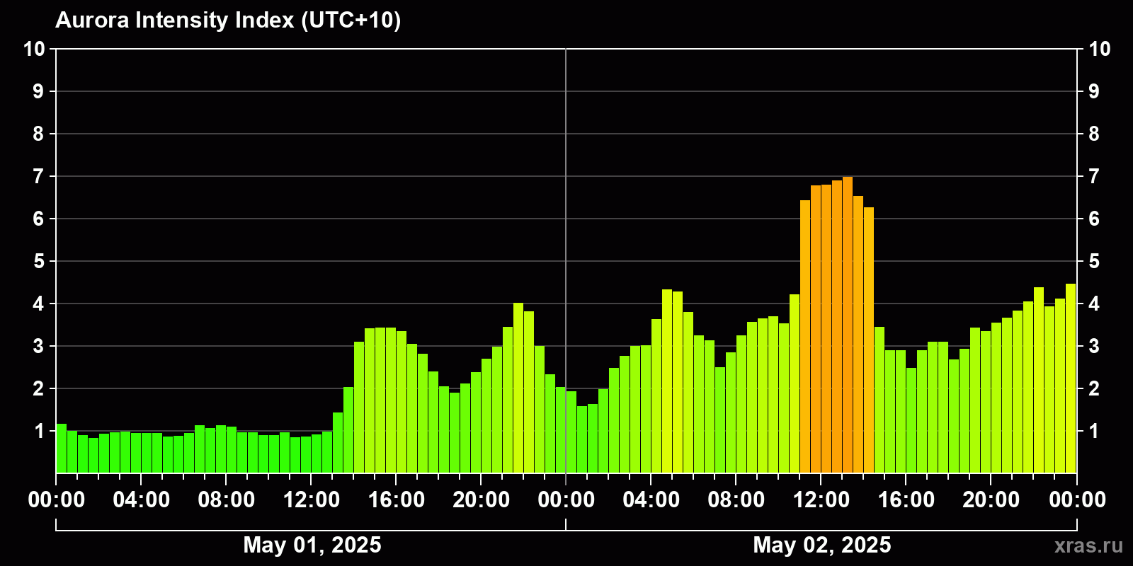 Changes in the auroral intensity index from 2025-05-01 to 2025-05-02 local time