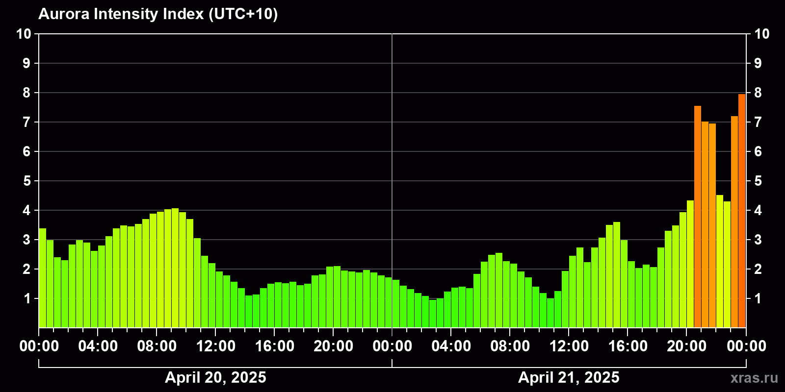Changes in the auroral intensity index from 2025-04-21 to 2025-04-22 local time