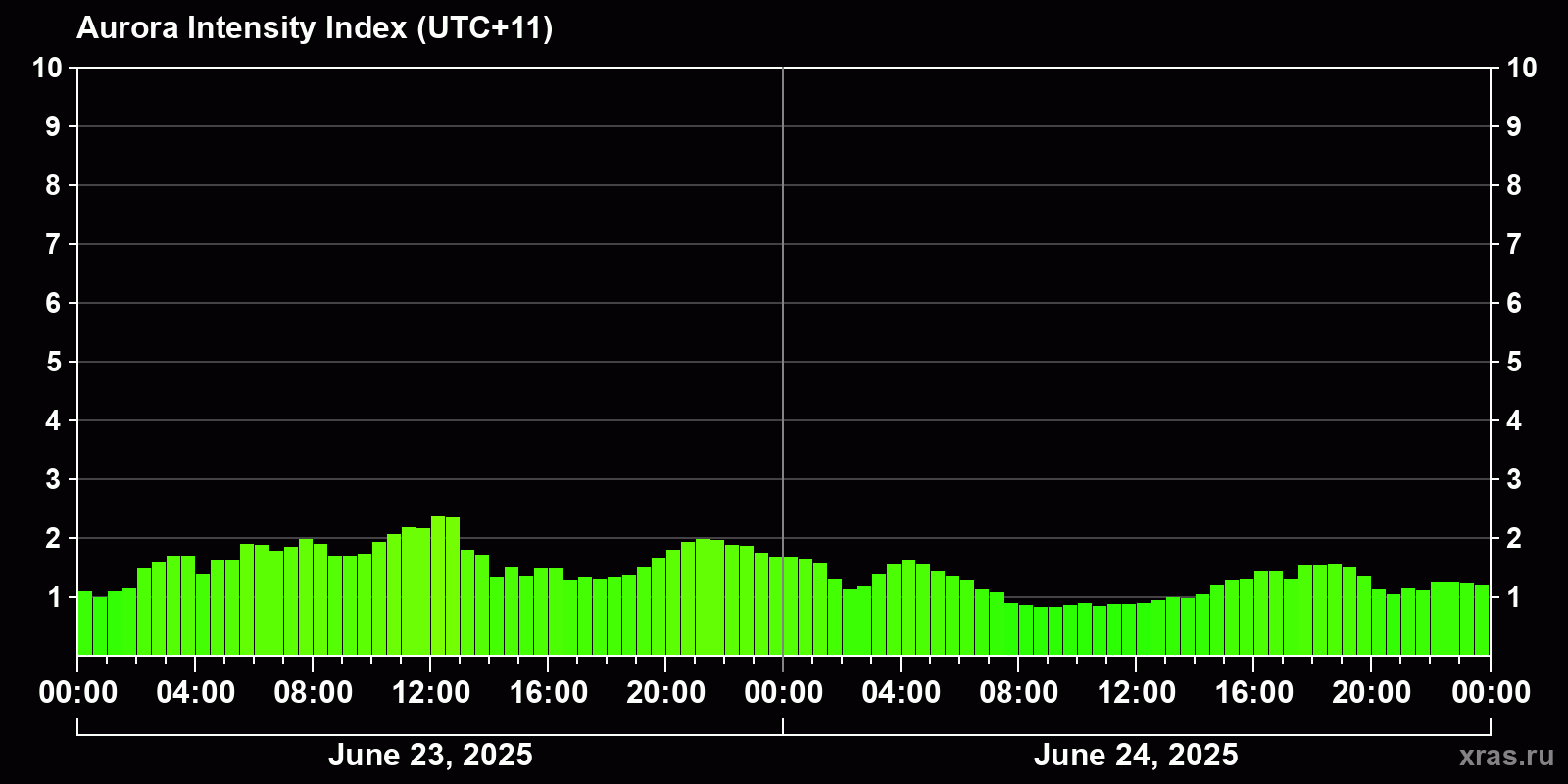 Changes in the auroral intensity index from 2025-06-23 to 2025-06-24 local time