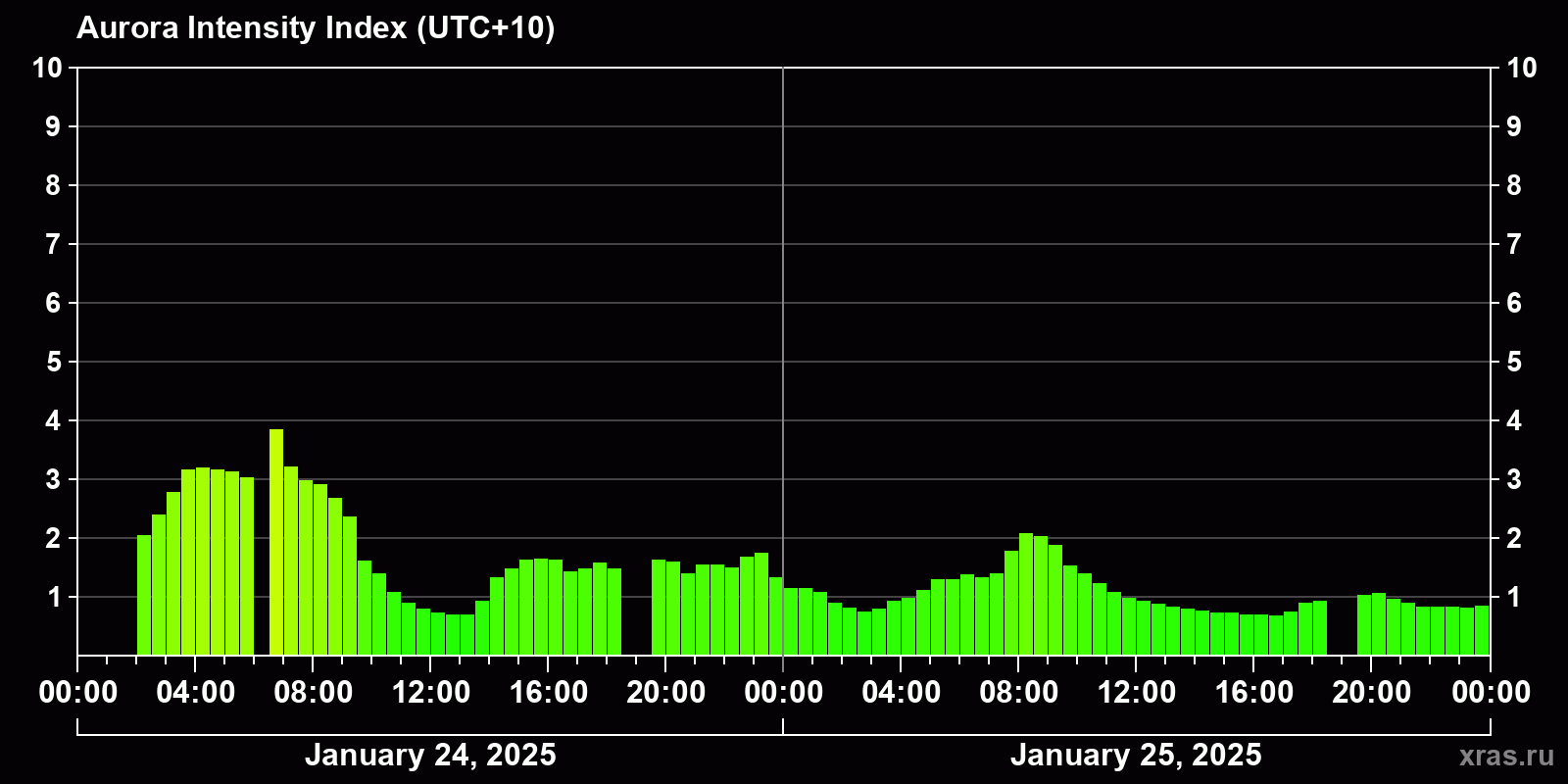 Changes in the auroral intensity index from 2025-01-24 to 2025-01-25 local time