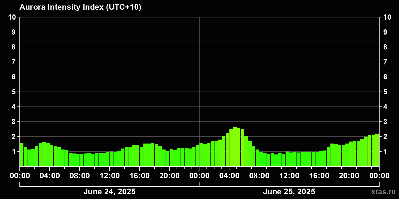 Changes in the auroral intensity index from 2025-06-25 to 2025-06-26 local time