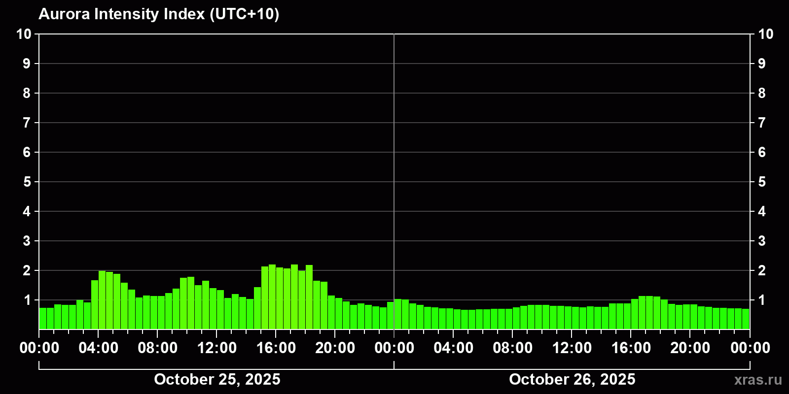 Changes in the auroral intensity index from 2025-10-25 to 2025-10-26 local time