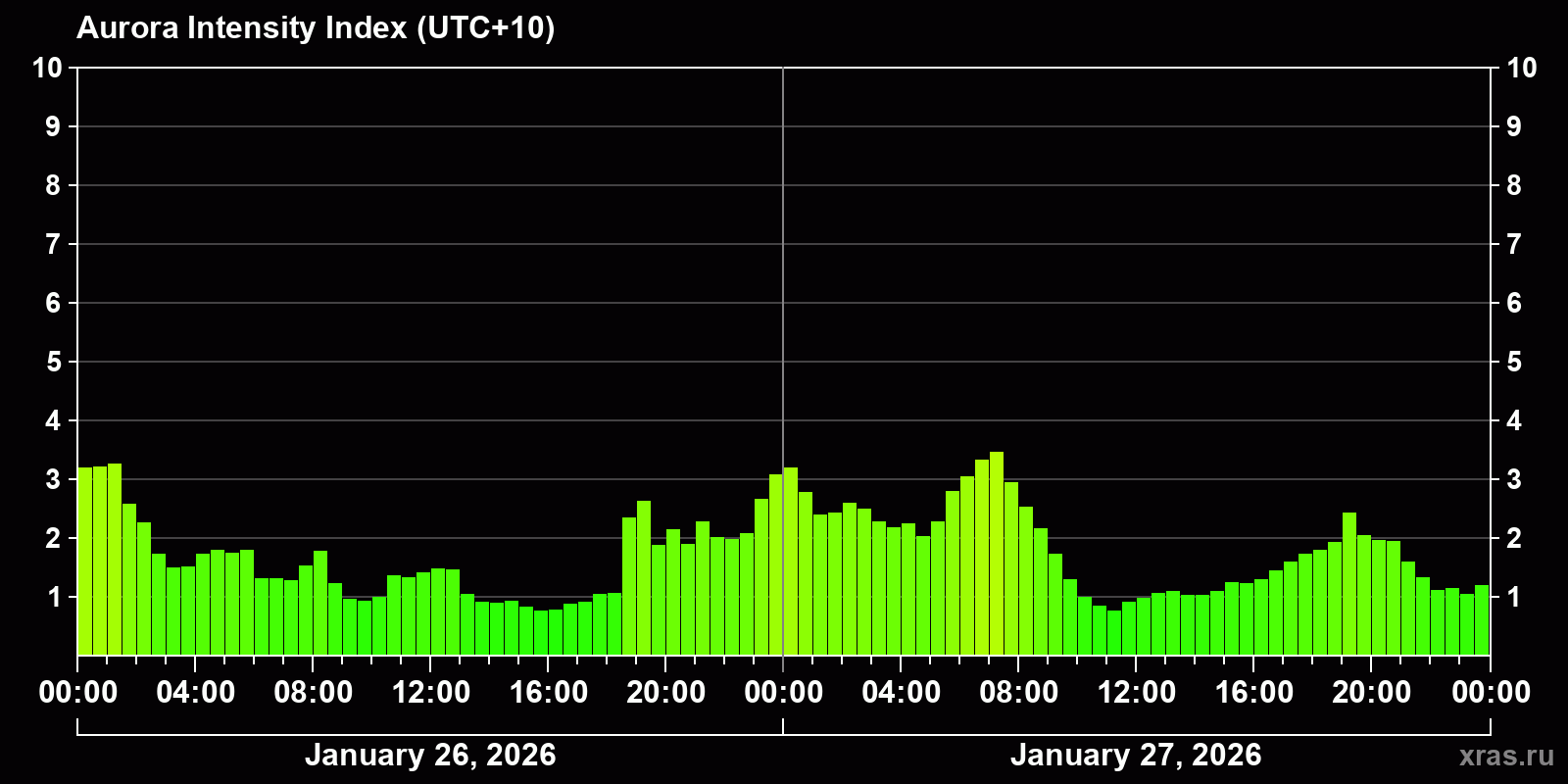 Changes in the auroral intensity index from 2026-01-26 to 2026-01-27 local time