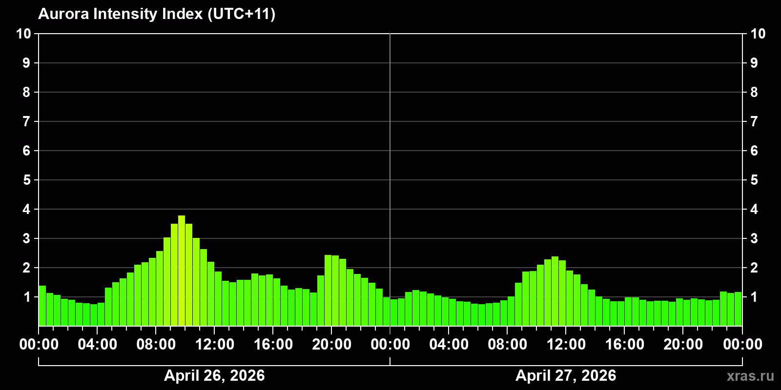 Changes in the auroral intensity index from 2026-04-26 to 2026-04-27 local time