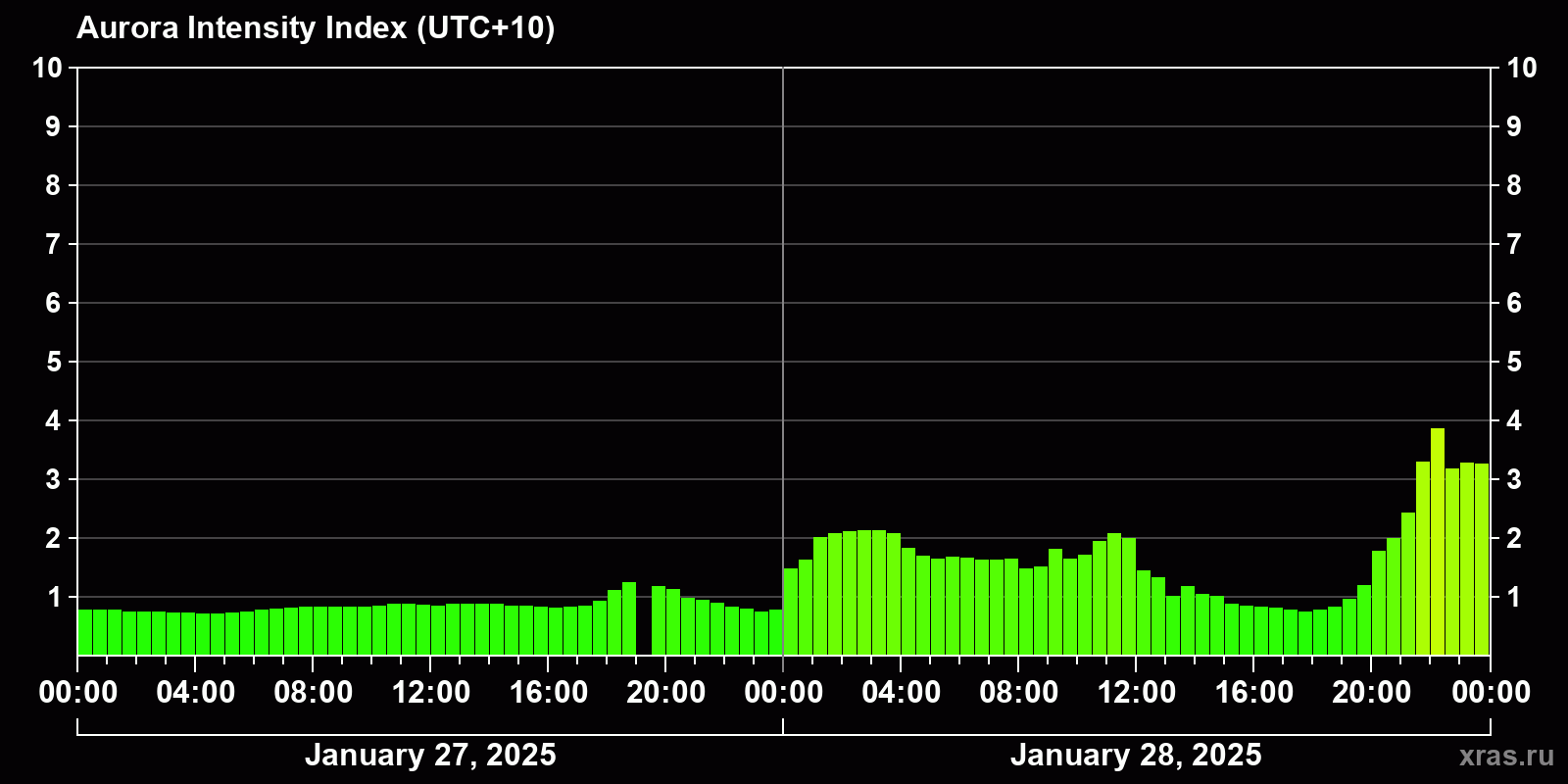 Changes in the auroral intensity index from 2025-01-27 to 2025-01-28 local time