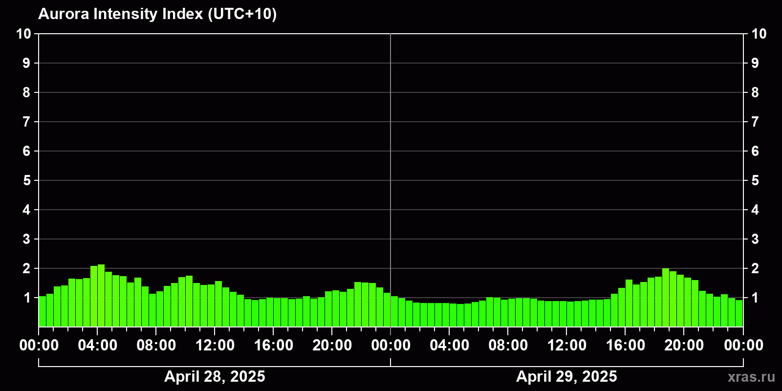 Changes in the auroral intensity index from 2025-04-29 to 2025-04-30 local time