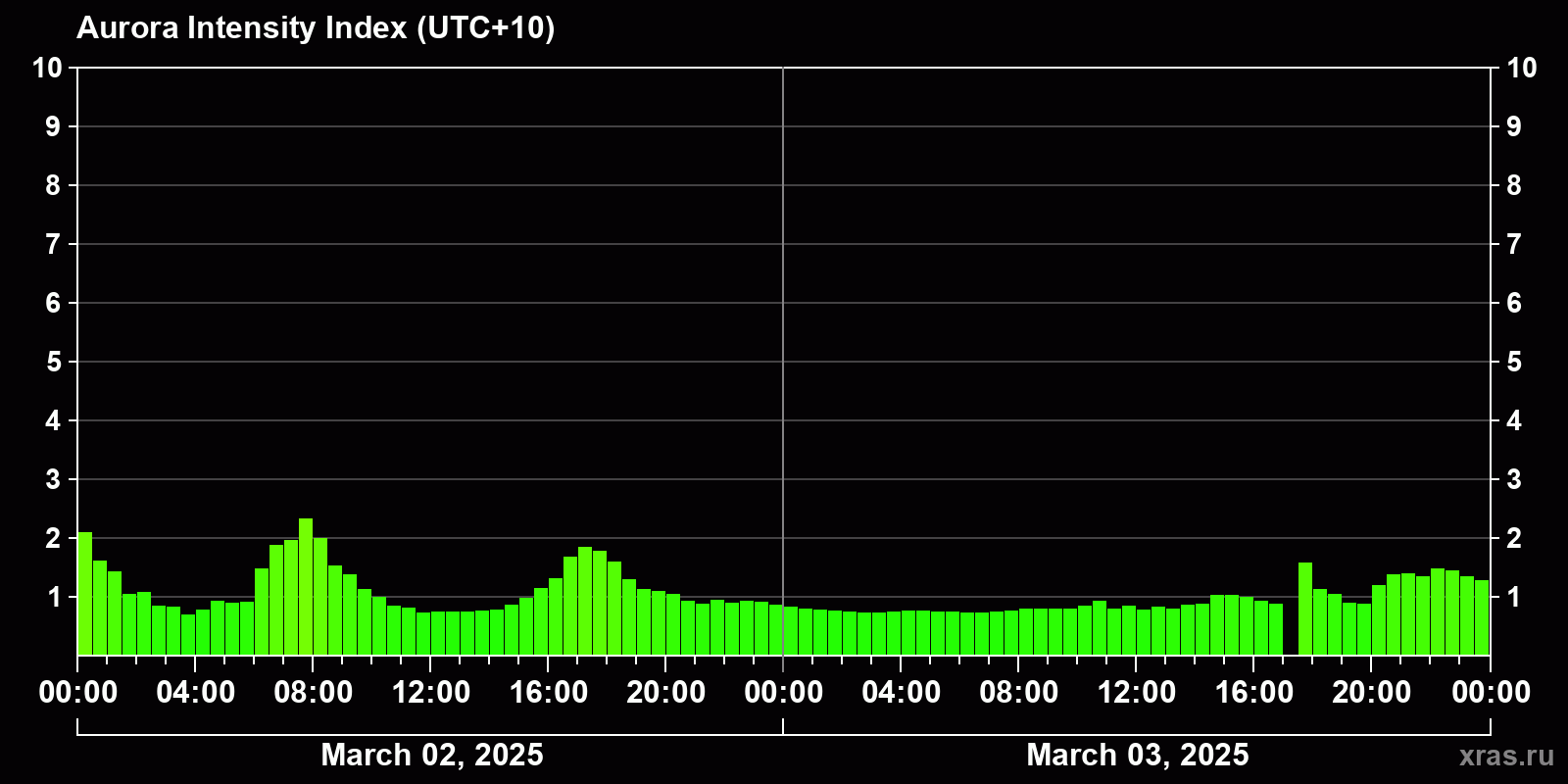 Changes in the auroral intensity index from 2025-03-02 to 2025-03-03 local time