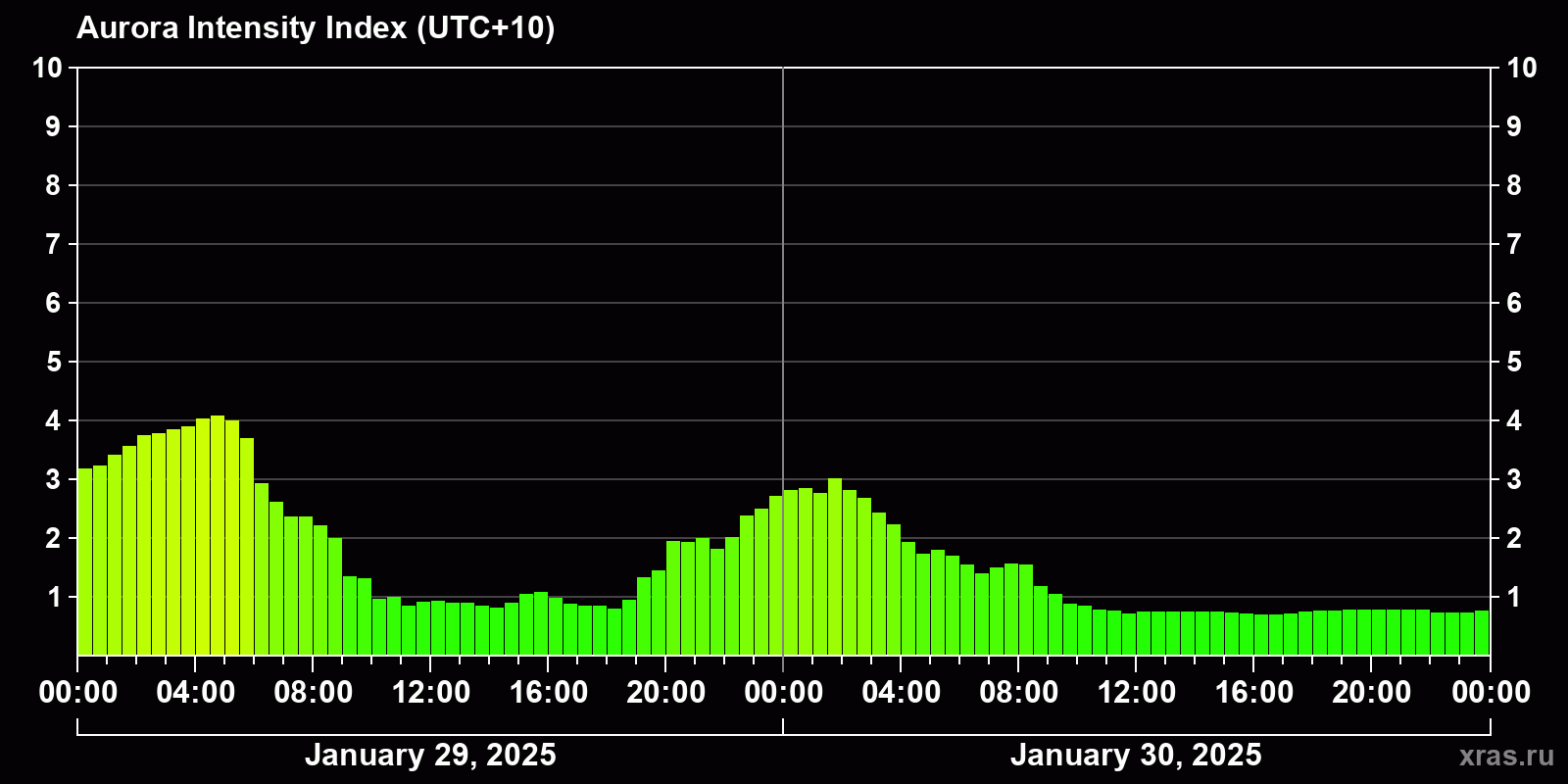 Changes in the auroral intensity index from 2025-01-29 to 2025-01-30 local time