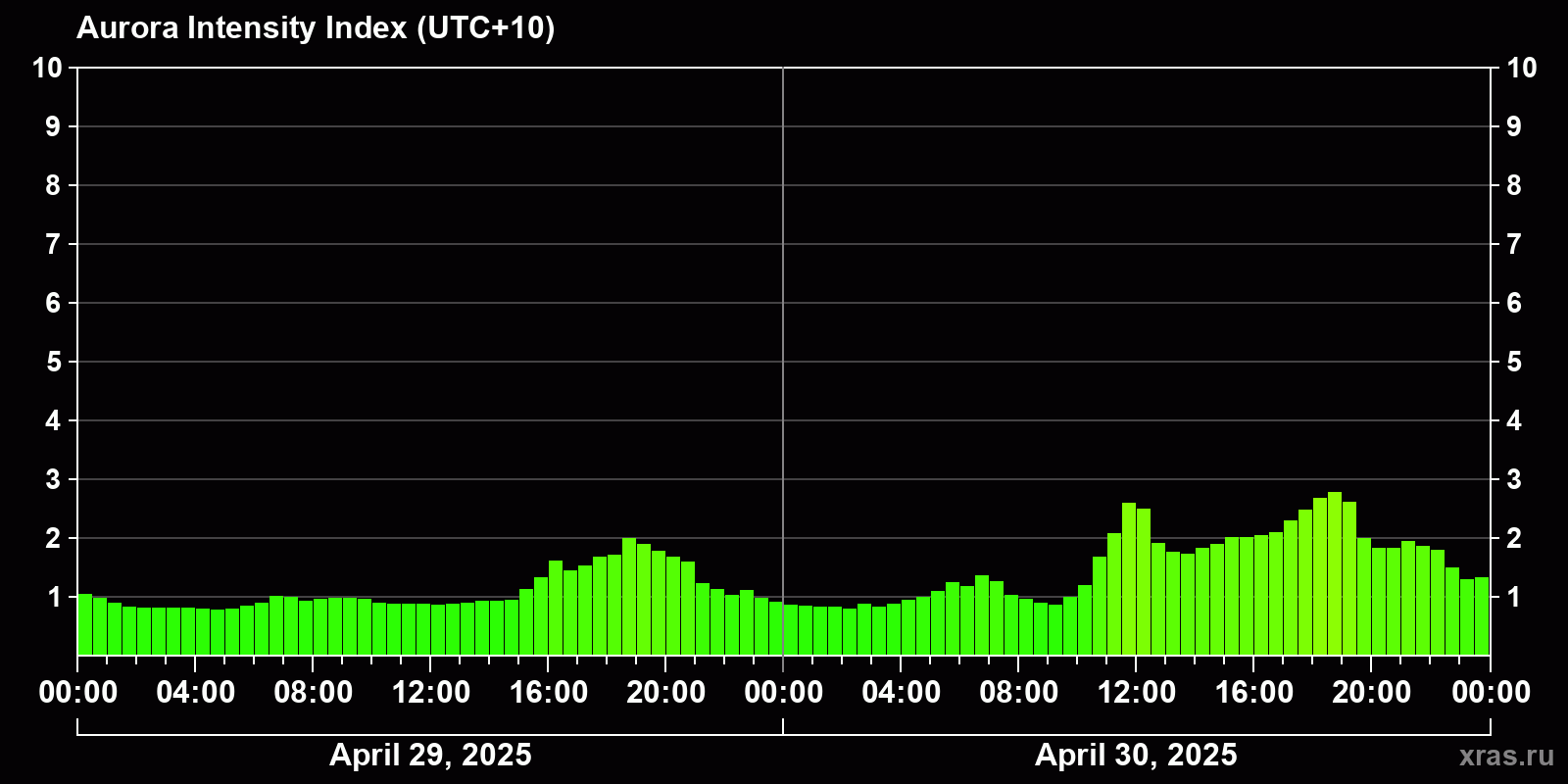 Changes in the auroral intensity index from 2025-04-30 to 2025-05-01 local time
