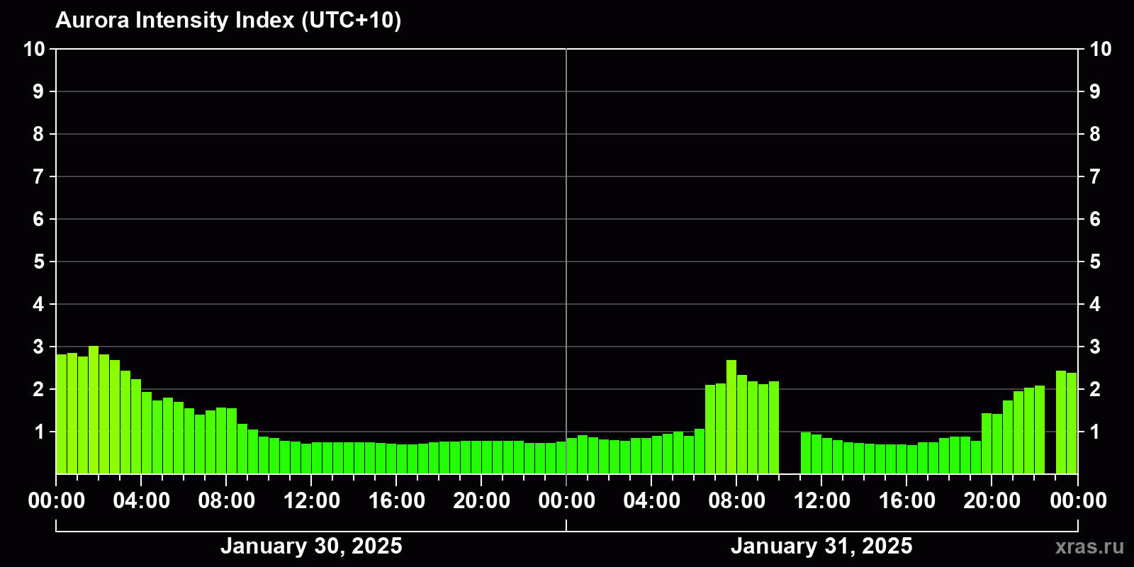 Changes in the auroral intensity index from 2025-01-30 to 2025-01-31 local time