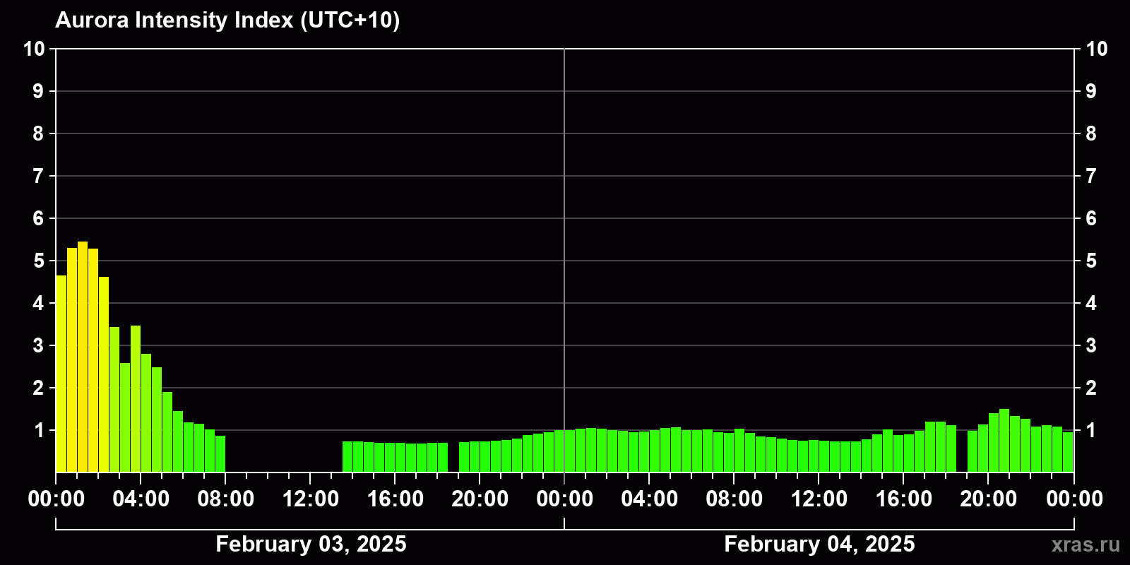 Changes in the auroral intensity index from 2025-02-03 to 2025-02-04 local time