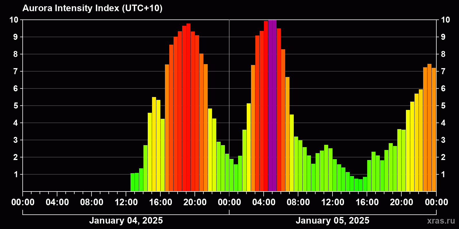 Changes in the auroral intensity index from 2025-01-04 to 2025-01-05 local time