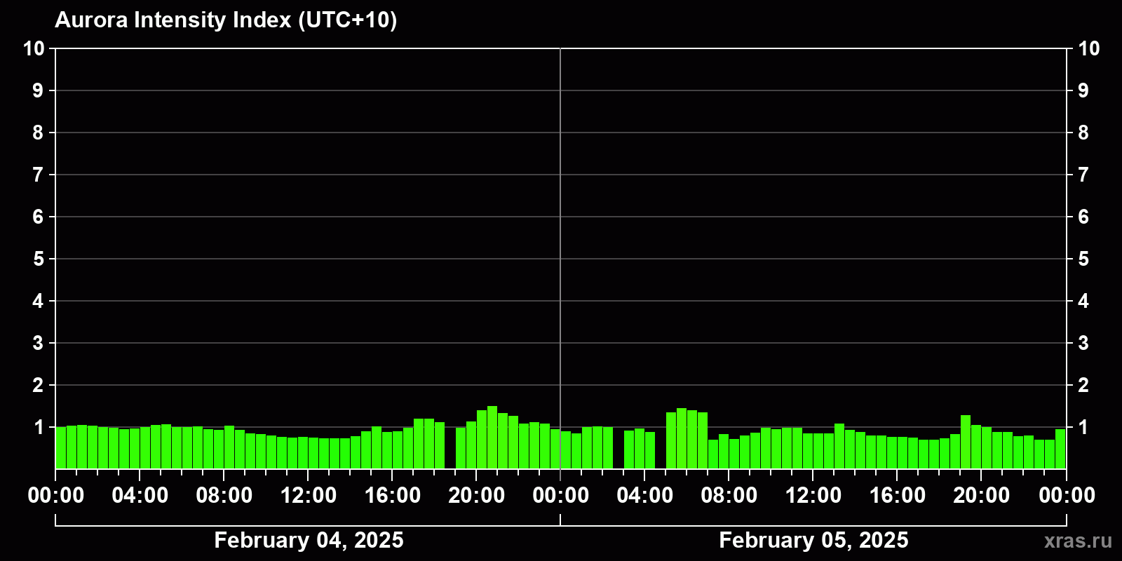 Changes in the auroral intensity index from 2025-02-04 to 2025-02-05 local time