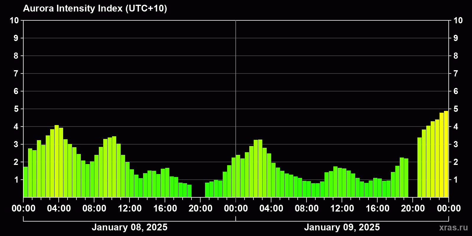 Changes in the auroral intensity index from 2025-01-08 to 2025-01-09 local time