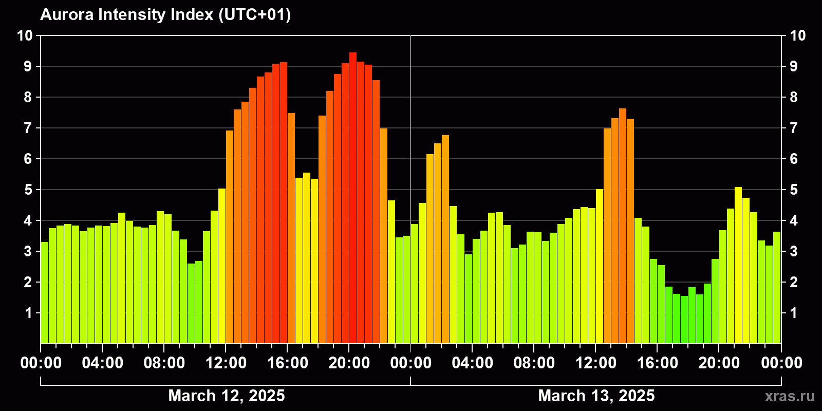 Changes in the auroral intensity index from 2025-03-12 to 2025-03-13 local time