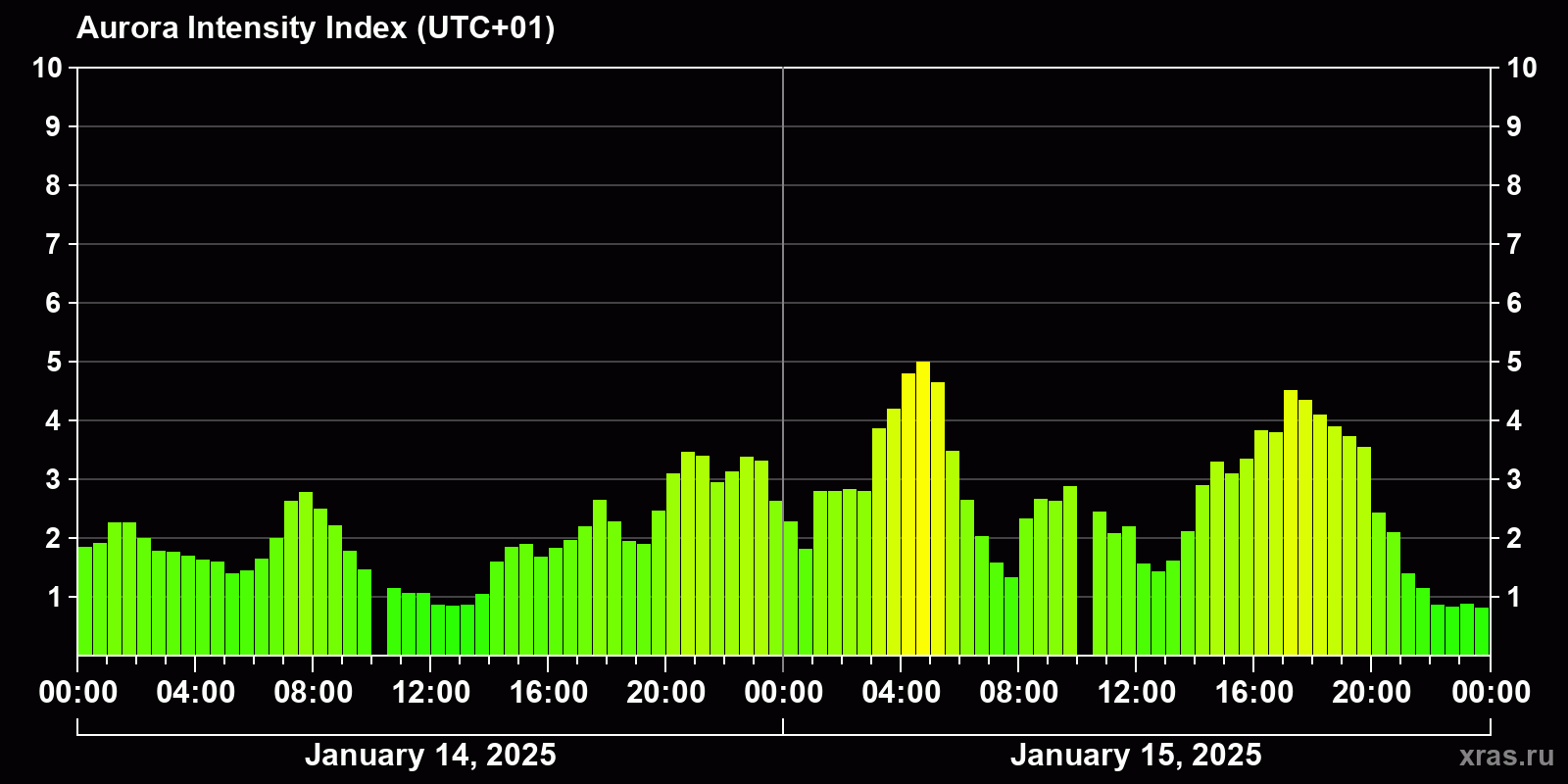 Changes in the auroral intensity index from 2025-01-14 to 2025-01-15 local time