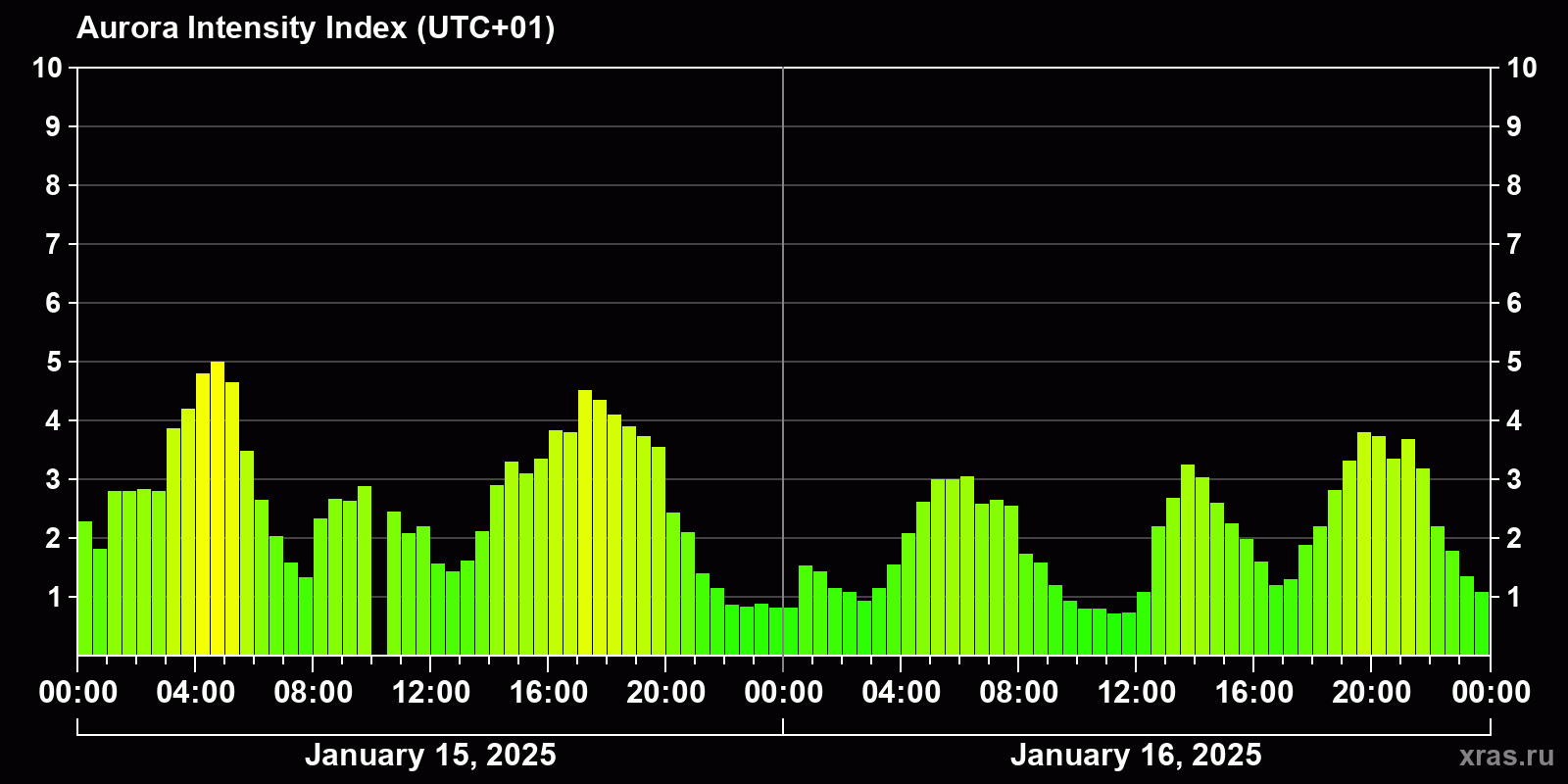 Auroral intensity index and the theoretically possible latitude of observations for nighttime in the Estern Hemisphere as of 2025-01-16 23:48 (end of day) local time