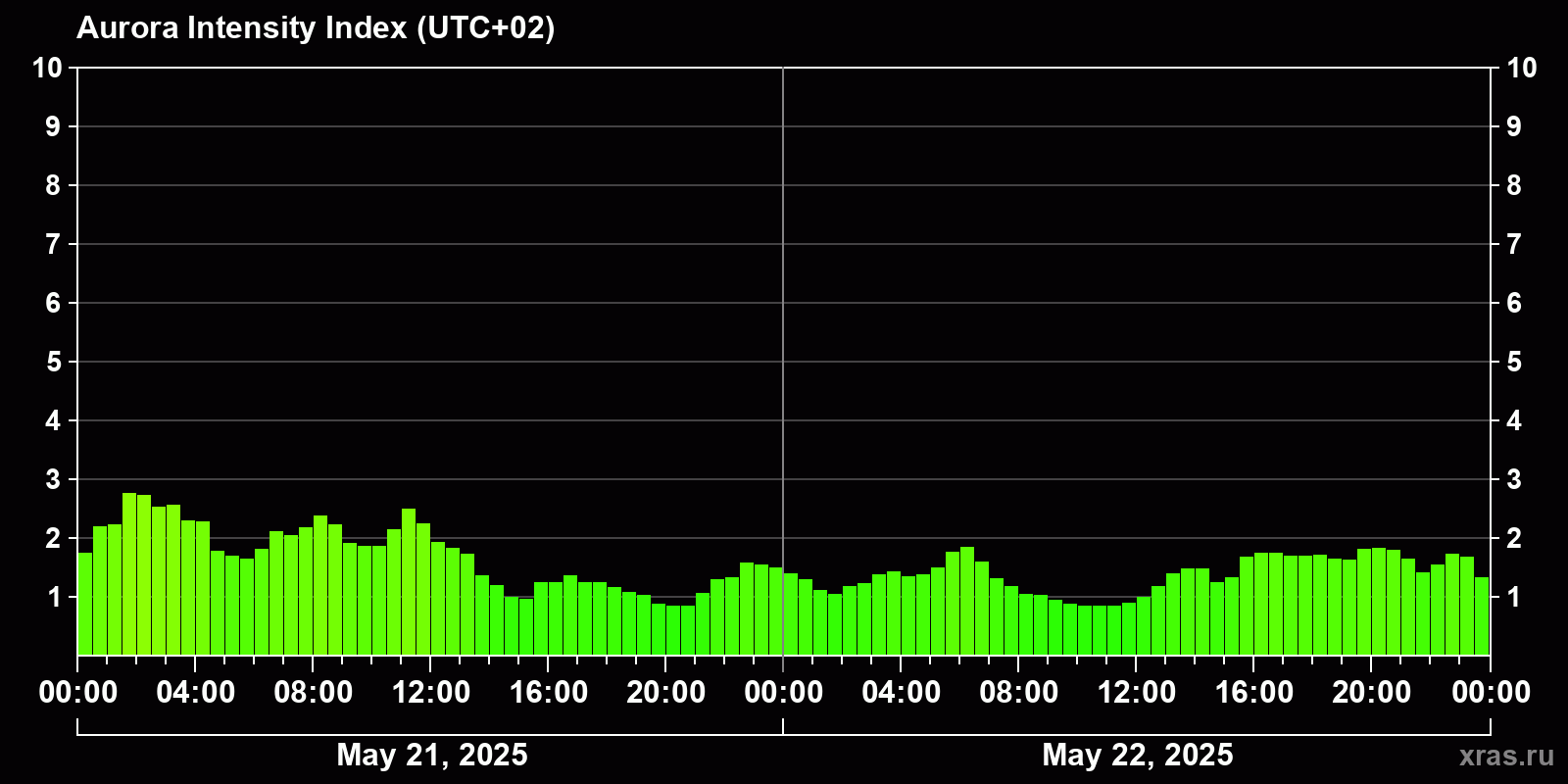 Auroral intensity index and the theoretically possible latitude of observations for nighttime in the Estern Hemisphere as of 2025-05-22 23:50 (end of day) local time