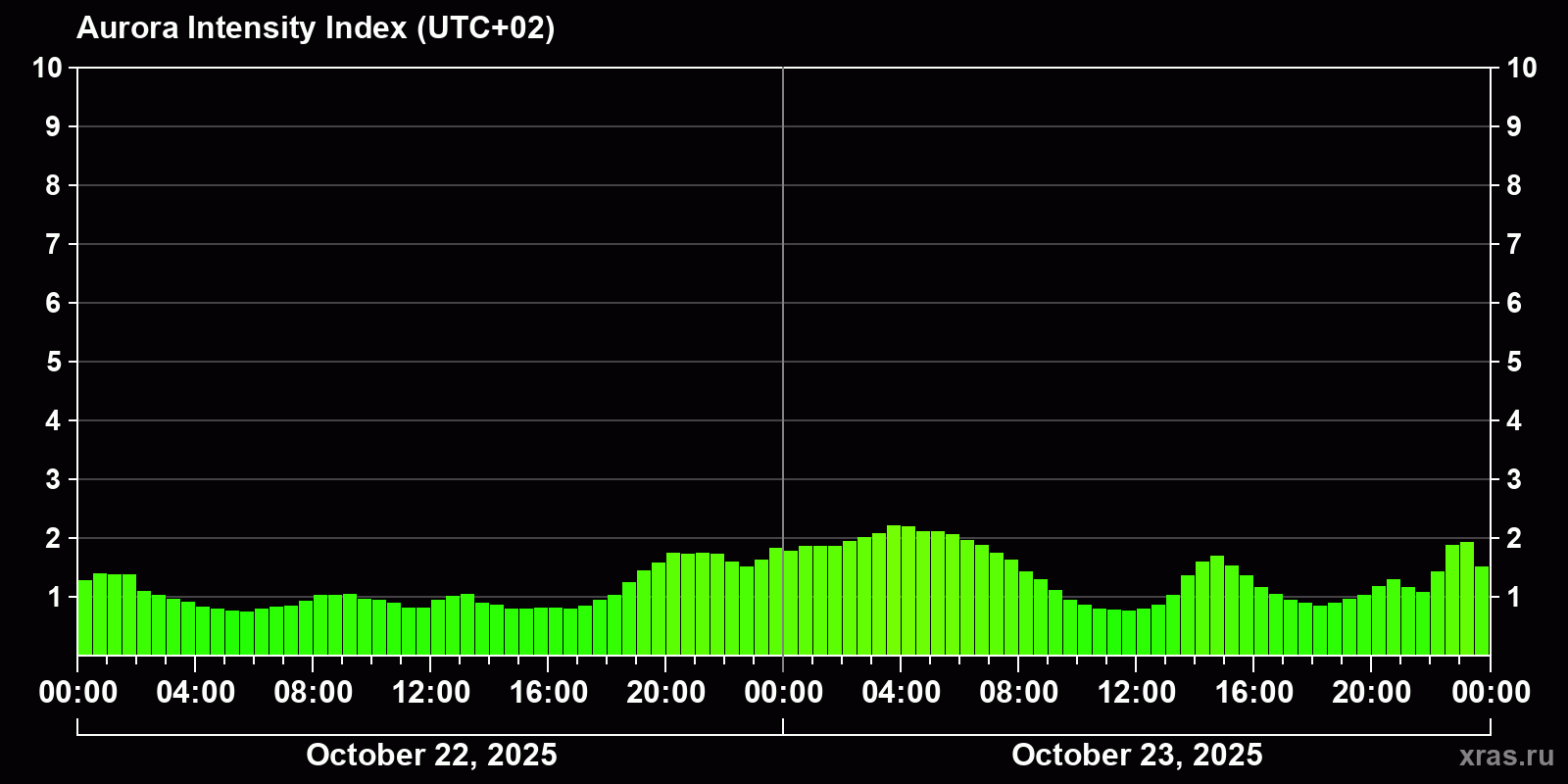 Auroral intensity index and the theoretically possible latitude of observations for nighttime in the Estern Hemisphere as of 2025-10-23 23:58 (end of day) local time