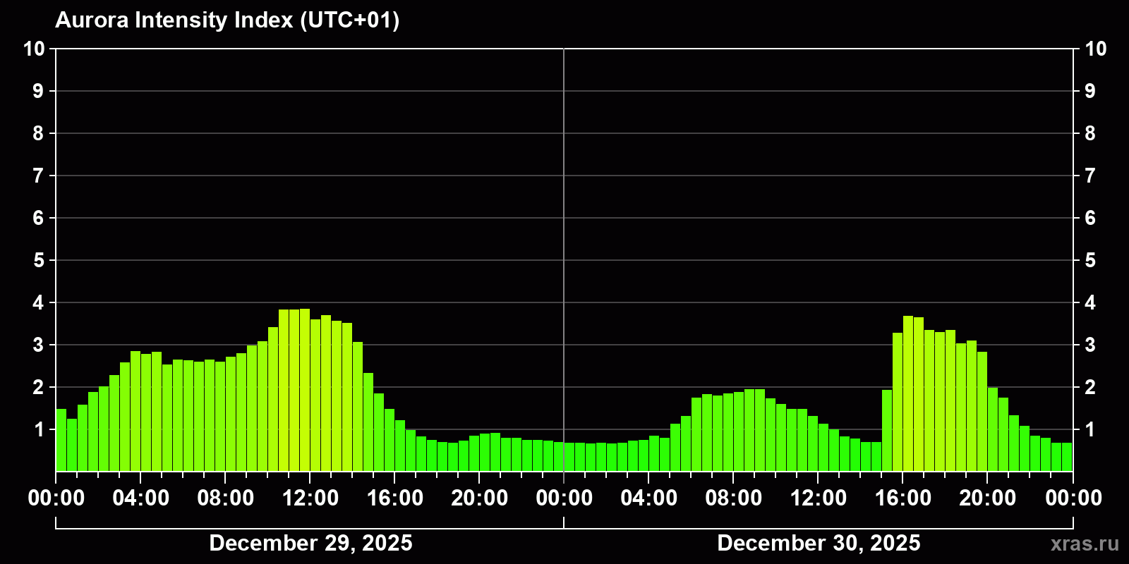 Changes in the auroral intensity index from 2025-12-29 to 2025-12-30 local time