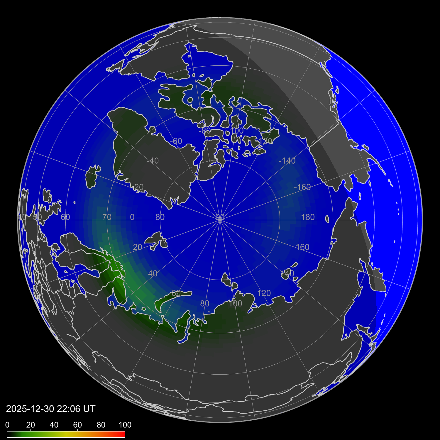 Изменения и часовой прогноз индекса интенсивности полярных сияний с 2025-12-31 по 2026-01-01